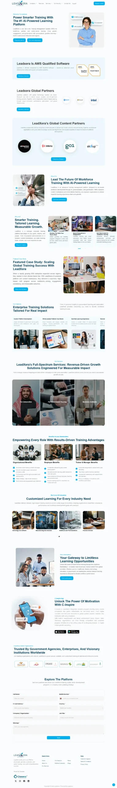 A website for Leadxera Training Management System – UI / UX – 11 Pages – Case Studies Custom Post Type – Control all Case Studies and their details from the backend system in WordPress – News Custom Post Type – Blog Custom Post Type – Contact Form